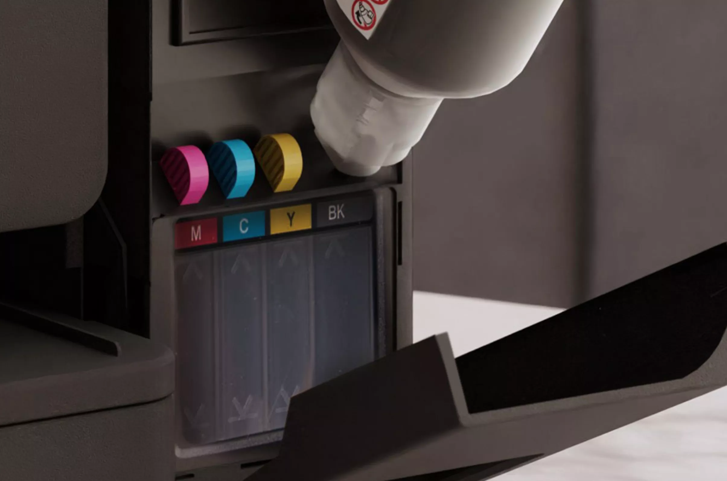 Cụm mực in thiết kế phía trước tích hợp công nghệ nạp mực chống tràn, dễ dàng theo dõi và đảm bảo mỗi lần nạp mực đều sạch sẽ và chính xác.